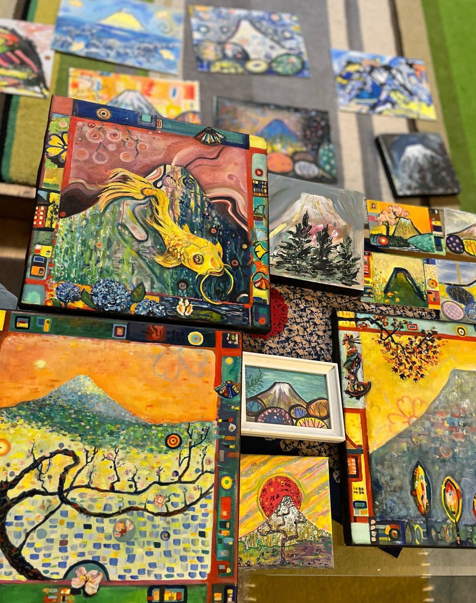 The paintings feature colourful landscapes, natural elements, and symbolic shapes. These paintings embrace a variety of textures and patterns, creating a visually captivating experience. The light hearted and yet bold renditions of the iconic symbol of the mountain found in Japan provoke a imaginative and happy response in their viewers.